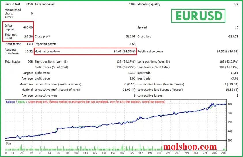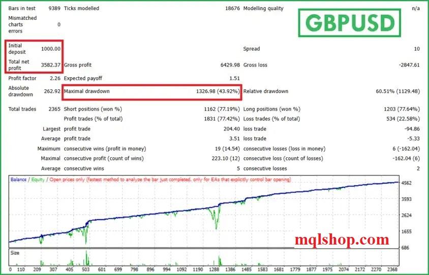Backtest results on the EURUSD pair show a net profit of $196.26 with a maximum drawdown of 14.59%. Meanwhile, on the GBPUSD pair, the net profit reached $3582.37, with a maximum drawdown of 43.92%.