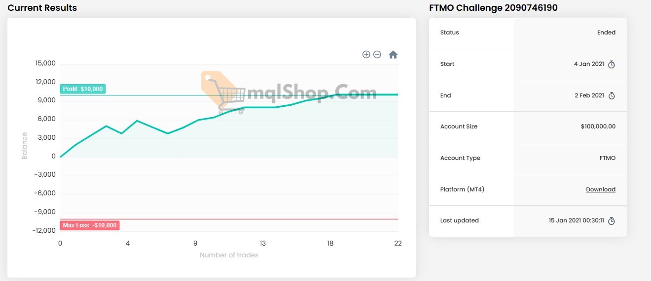 - Outstanding performance: Achieved the $10,000 profit target on a $100,000 FTMO account in just 22 trades.