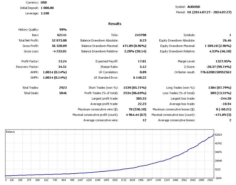 - AUDUSD: Net profit of 52,073.08 USD, with Profit Factor 13.24, and drawdown of 4.53%.
