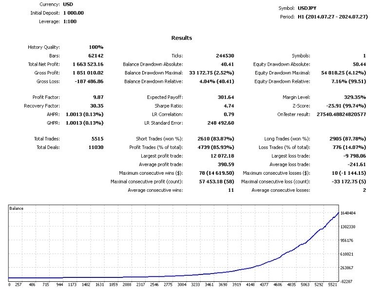- USDJPY: Net profit of 1,663,523.16 USD with an initial deposit of 1,000 USD, Profit Factor 9.87, and a maximum drawdown of 7.16% over a 10-year period.