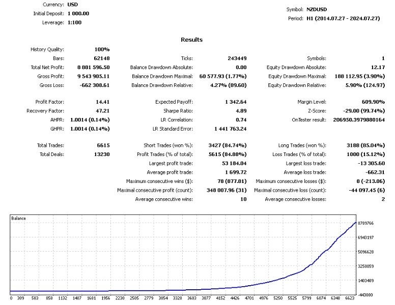 - NZDUSD: Net profit of 8,881,996.50 USD, Profit Factor 14.41, with a drawdown of only 5.90%.