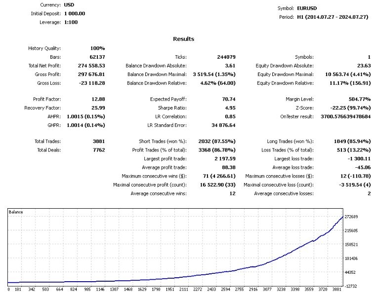 - EURUSD: Net profit of 274,558.53 USD, Profit Factor 12.88, and a drawdown of 11.17%.