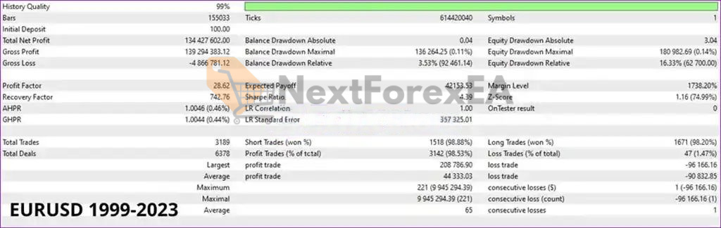• EURUSD 1999-2023: 134,427,502% total profit, 0.14% max drawdown, 28.62 profit factor