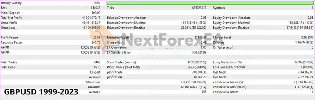 • GBPUSD 1999-2023: 44,304,870% total profit, 1.73% max drawdown, 22.03 profit factor
