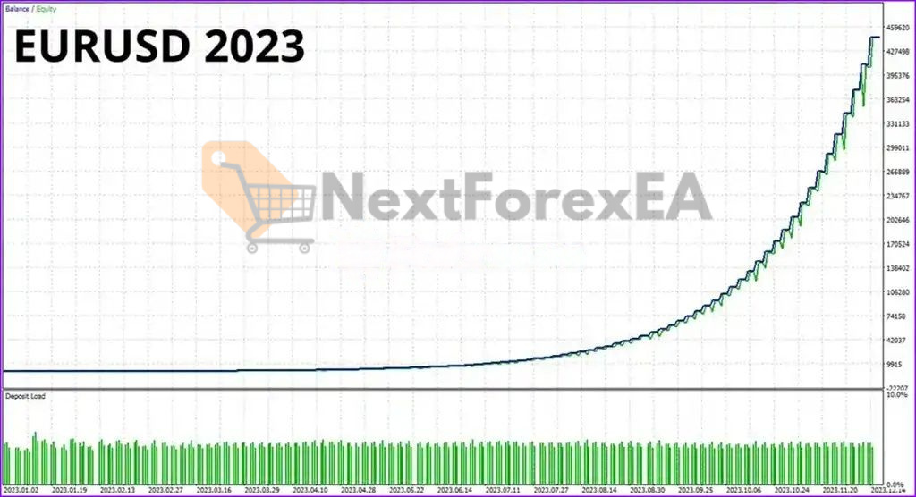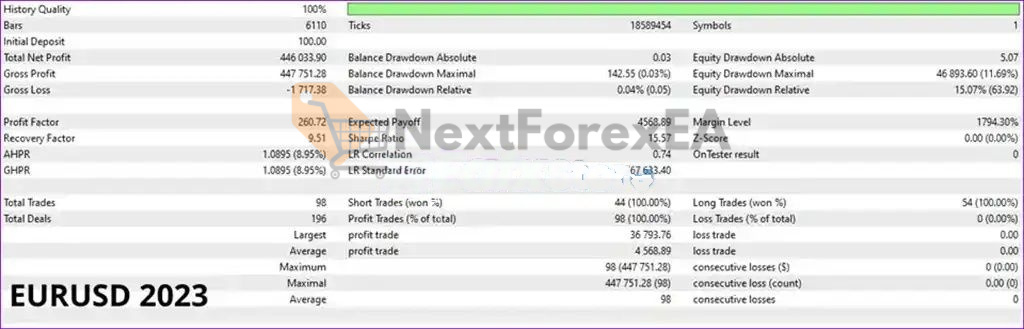 • EURUSD 2023: 446,033% profit on $100 deposit, 11.69% max drawdown, 260.72 profit factor
