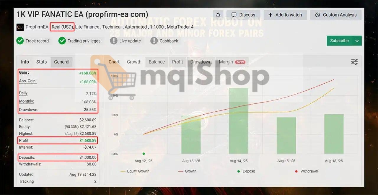 Verified live tracking demonstrates consistent multi-pair execution with full transparency. Live account data shows 168% growth from $1,000 to $2,680.89 over 7-day period with 25.55% peak drawdown. Suitable for traders comfortable with grid recovery mechanics and adequate capitalization for diversified position management.