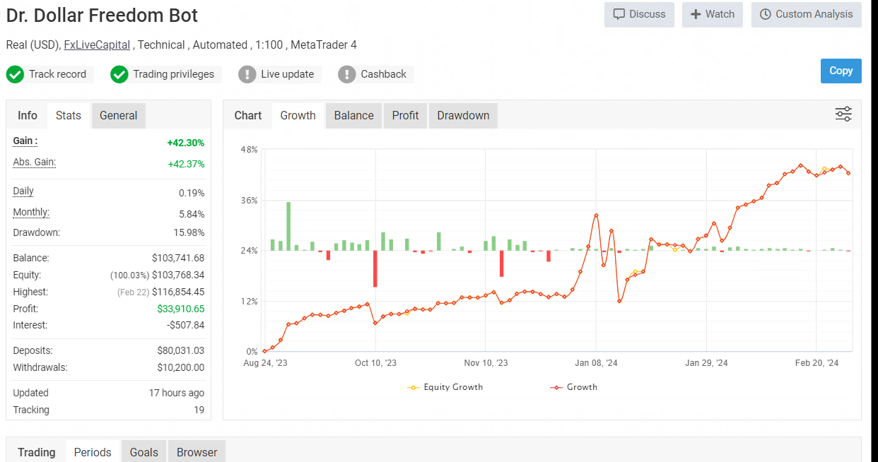 - Proven Track Record: Boasts a gain of +42.30% with a modest drawdown of 15.98%, reflecting its balance between profitability and risk management.