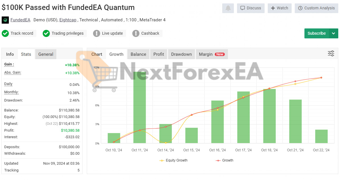 FundedEA Quantum Premium MT4: AI-powered prop firm automation achieving 10.38% gains with 2.46% max drawdown. Smart Grid RSI strategy for FTMO challenges.