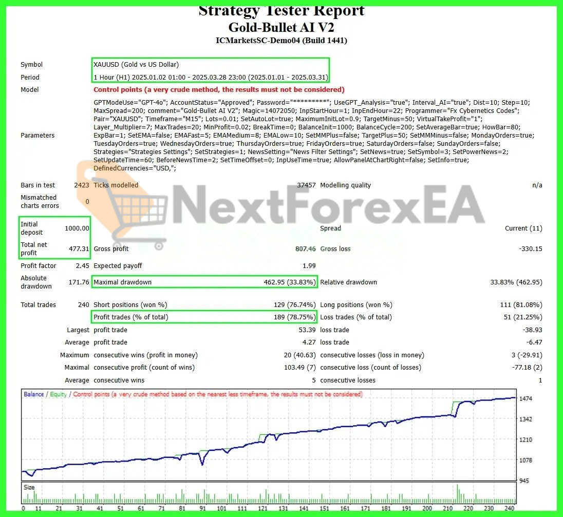 Gold-Bullet AI EA MT4 breaks new ground as the first automated trading solution to integrate OpenAI’s GPT-4o artificial intelligence for sophisticated XAUUSD market analysis and trade execution. While demonstrating extensive trading activity in backtests, the acknowledged testing limitations require users to approach performance claims with appropriate caution.