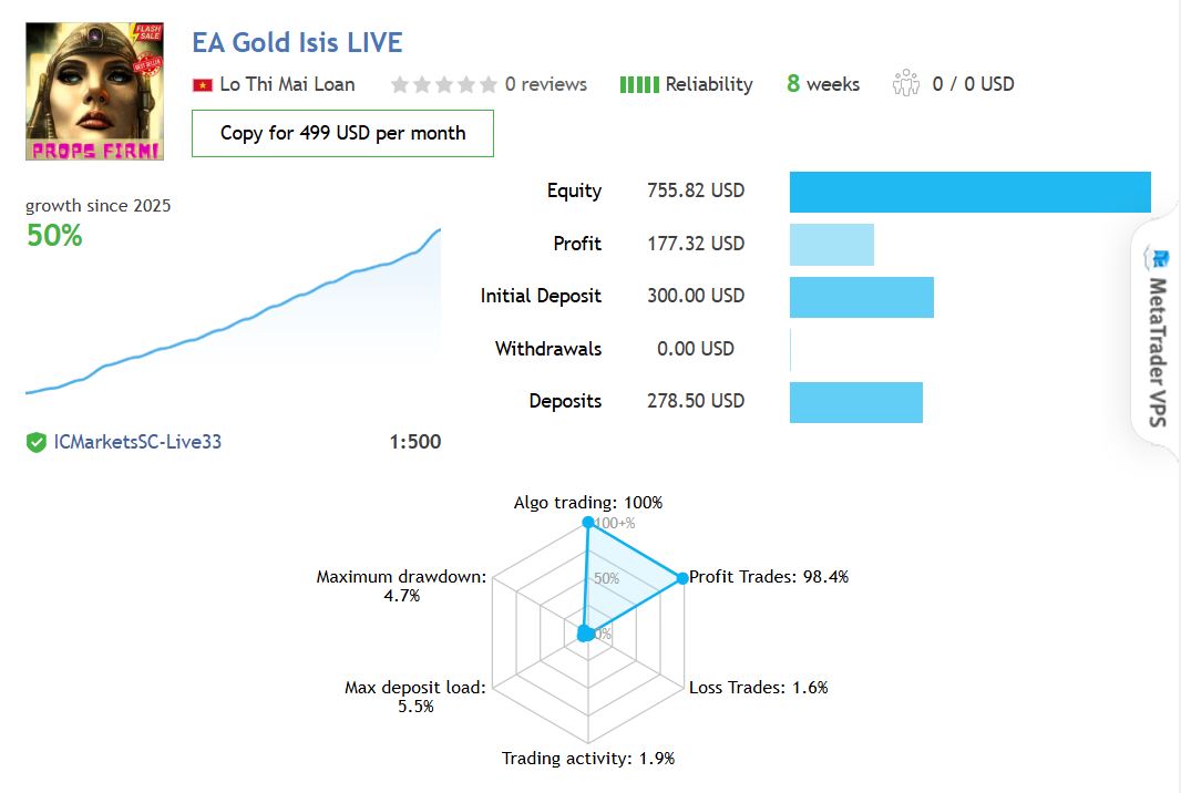 Gold ISIS EA exemplifies a balance of high profitability and controlled risk, underscored by a 40% growth in live trading over six weeks with a maximum drawdown of 4.7%. It weaves together effective risk management and innovative trading strategies without relying on high-risk tactics like martingale or grid strategies. Reviews from users highlight its adaptability and consistent returns, reinforced by a win rate consistently above 80%.