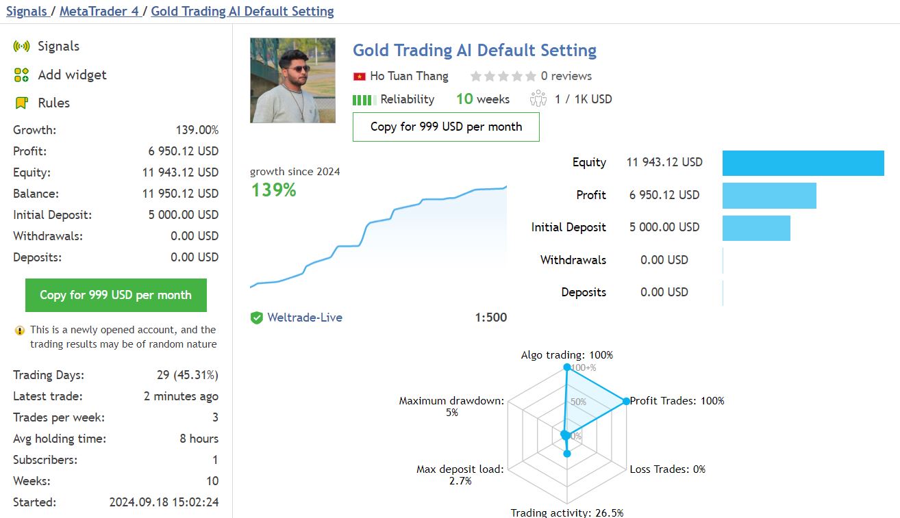 - Impressive profit: Gold Trading AI achieved 139% profit over 10 weeks of trading, with a maximum drawdown of only 5%.