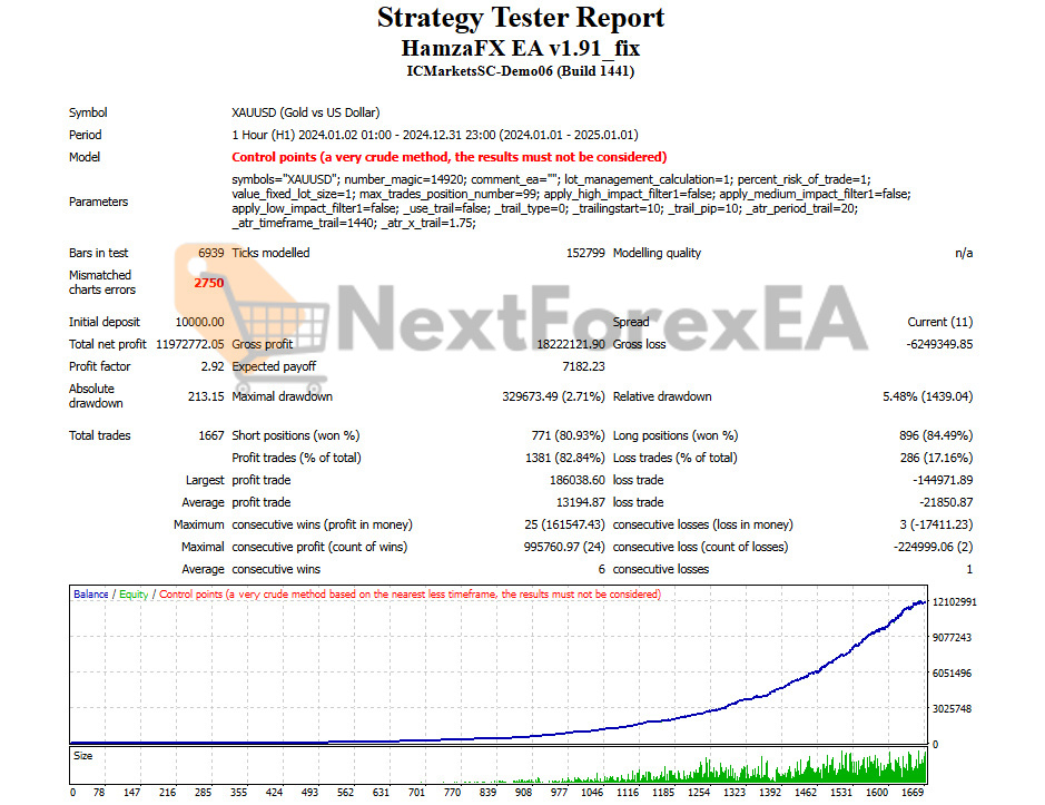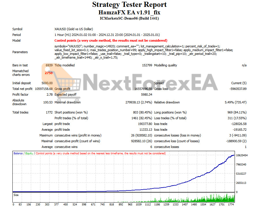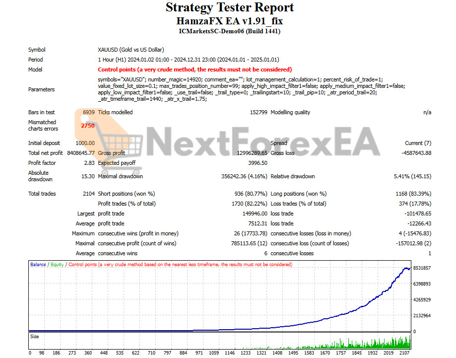 - Win rates: 80.45%-84.49% across test periods – exceptional consistency but derived from “Control points” modeling MetaTrader explicitly warns against