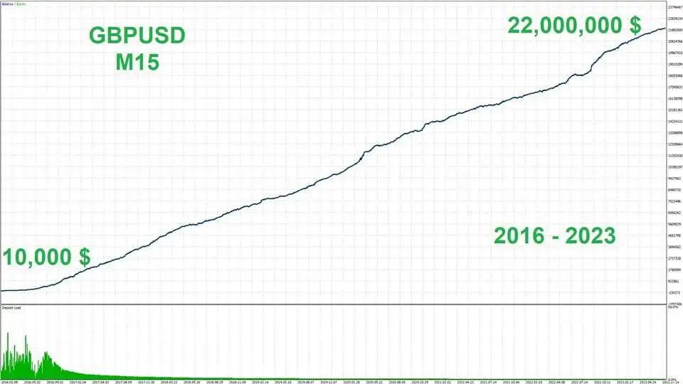 - Exceptional performance: Capital growth from $10,000 to $22,000,000 (GBPUSD M15, 2016-2023), maintaining low drawdowns.