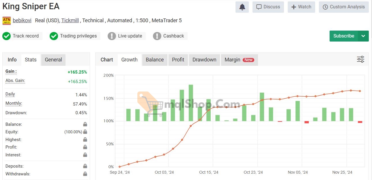 Live performance: Achieved a gain of +165.25% with a drawdown of only 0.45%, proving its reliability and effectiveness.