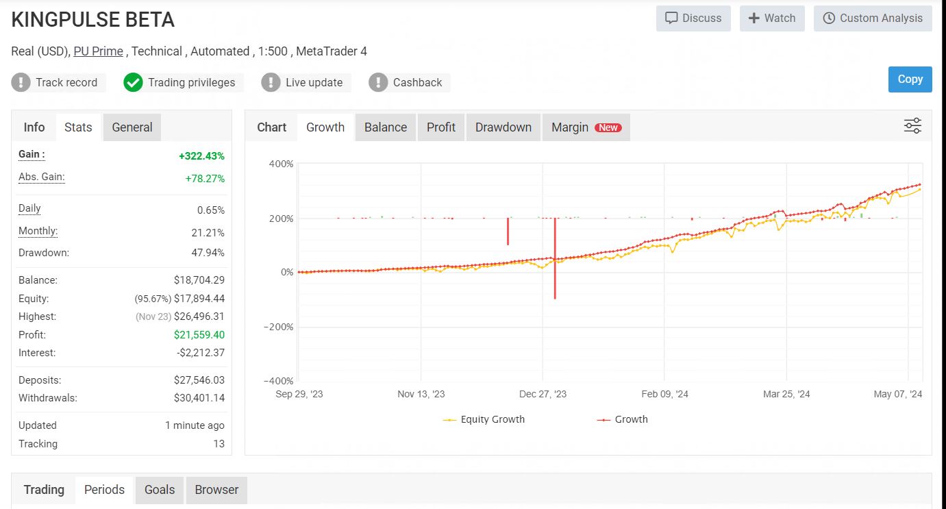 The KINGPULSE FX EA delivers as promised, providing a reliable tool for automating Forex trades. It has shown real results, with a gain of over 322.43% and a monthly return of 21.21%. While it operates effectively within the right settings, users should be cautious of its relatively high drawdown of 47.94%, suggesting a higher risk. Overall, for beginners aiming to automate their trading processes, KINGPULSE FX EA offers a substantial starting point but requires monitoring to manage potential risks effectively.