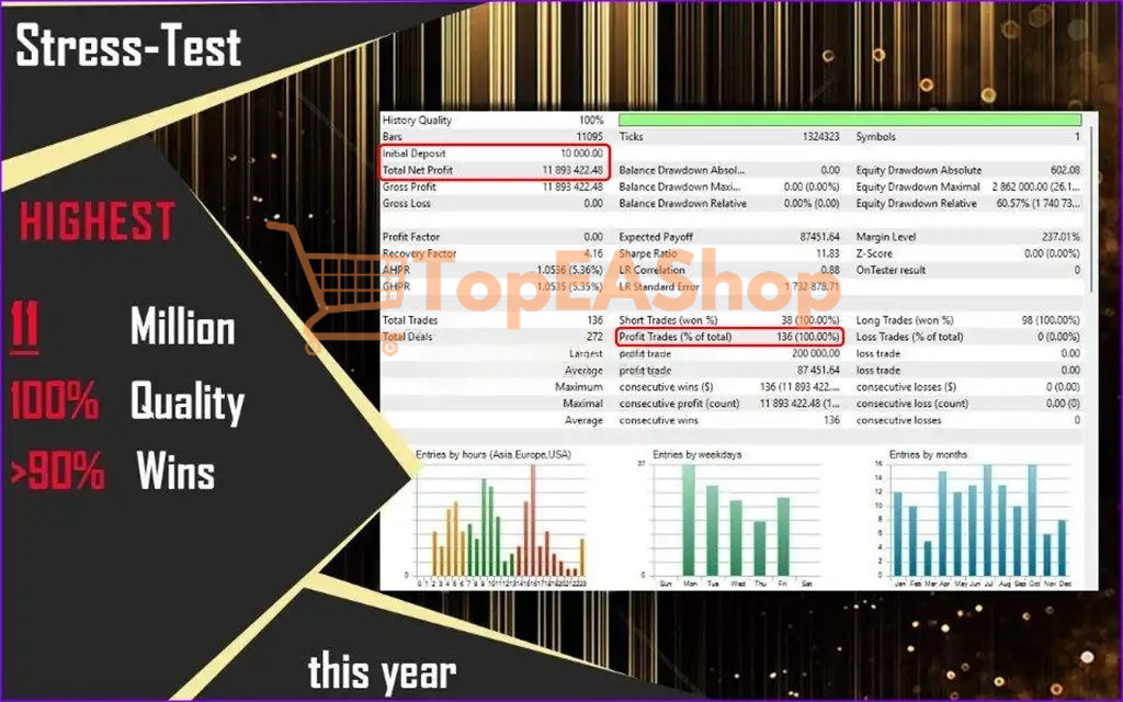 - Recent testing shows flawless execution with 136 profitable trades out of 136 total trades, generating $11.89 million from a $10,000 deposit.