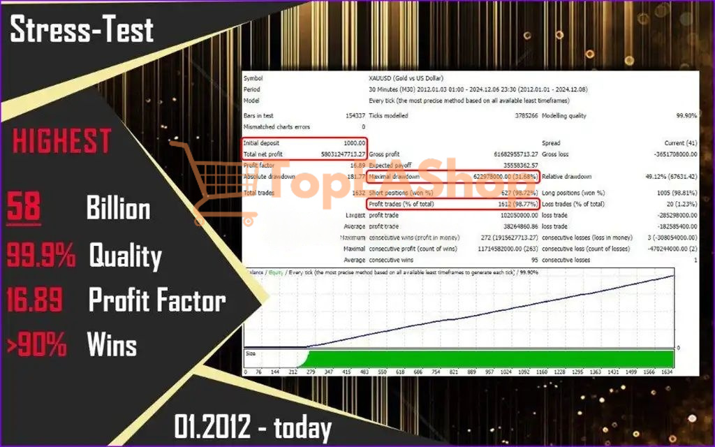 - Exceptional Profitability and Win Rate: Backtests reveal extraordinary performance metrics with a 100% win rate across 136 trades in recent tests. The EA generated a total net profit of $11.87 million from a $10,000 initial deposit, with a profit factor of 16.87, indicating it produces nearly 17 times more gross profit than gross loss. Long-term testing from 2012-2024 demonstrated a 98.77% win rate with $58 billion in total net profit from just $1,000 initial capital.