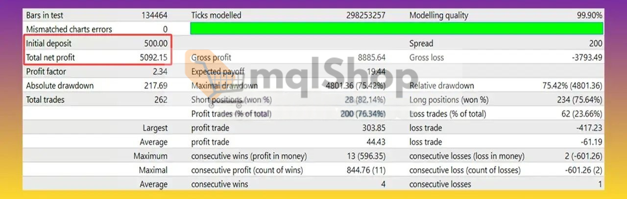 Backtest validation demonstrates consistent profitability with strong win rate maintained across 262 trades. The 2.34 profit factor and systematic grid approach suit traders seeking automated position management without constant oversight.
