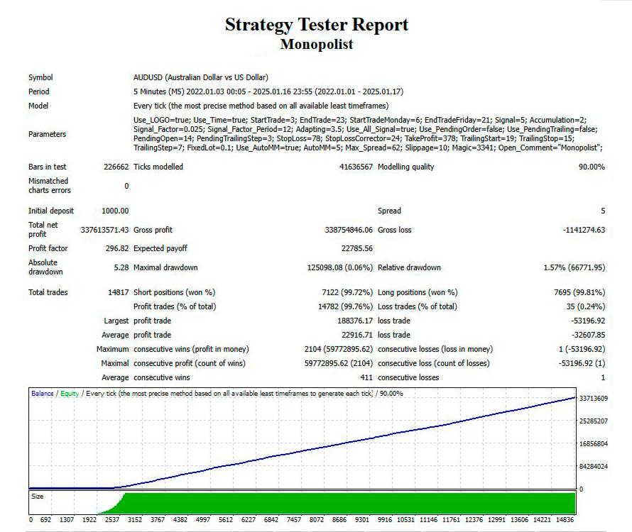 Monopolist EA is a powerful automated trading advisor developed by Konstantin Kulikov, designed specifically for scalping dynamic forex markets on the MetaTrader 4 platform. This sophisticated EA tackles the challenges of market volatility and spread fluctuations, particularly during high-impact trading periods like Friday market close. With its exceptional 99%+ win rate and ultra-low drawdown of less than 0.5%, Monopolist EA delivers consistent profitable trades through its specialized algorithms that adapt to changing market conditions. According to the latest backtest reports, the system has generated impressive returns with a profit factor exceeding 250, demonstrating its remarkable ability to capitalize on market inefficiencies while maintaining strict risk management.