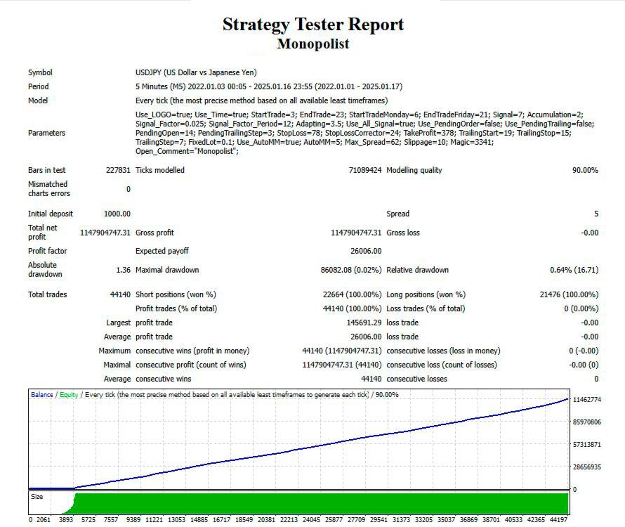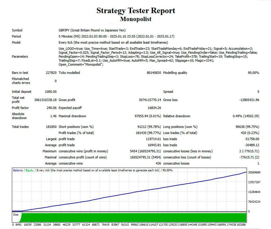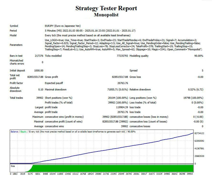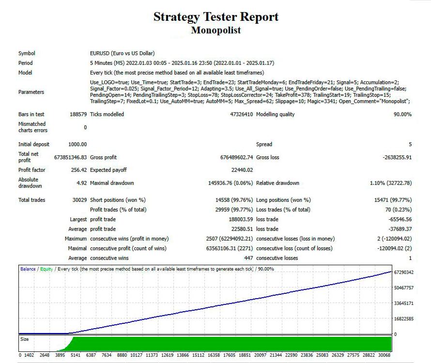 - Advanced Scalping Algorithm: Unlike conventional EAs, Monopolist employs a specialized trading mechanism that capitalizes on volatility and spread jumps, especially during Friday market close. The system’s ability to adapt to spread fluctuations allows it to maintain high profitability without employing risky strategies like martingale or grid trading.
