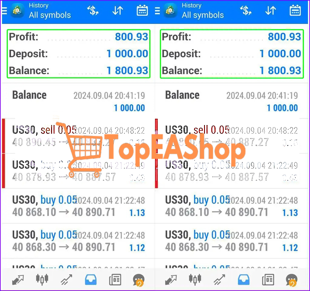 - Proven Performance Results: The EA has demonstrated remarkable efficiency, achieving a profit of $800.93 from an initial $1,000 deposit through strategic trading on the US30 index. In optimal conditions, it has generated as much as $190,000 in just 11 days, showcasing its potential when properly configured.