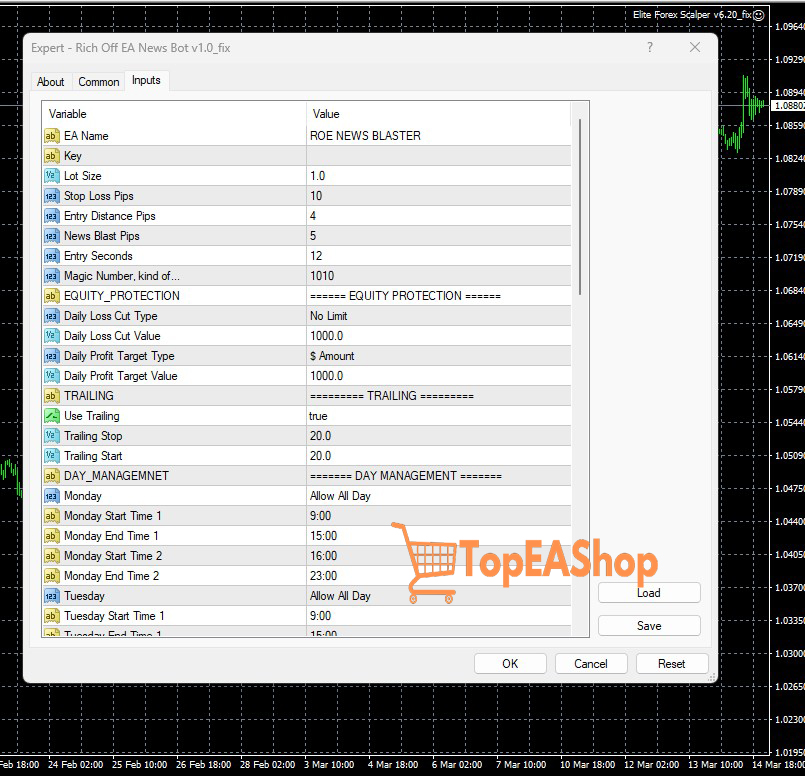 - Flexible Customization Options: Users can fine-tune critical parameters including lot size, news blast sensitivity (5 pips default), daily profit targets ($1,000), and specific trading schedules for different weekdays. This adaptability allows traders to align the EA with their risk tolerance and account size for optimal performance.