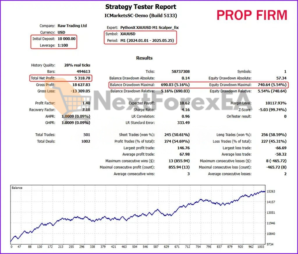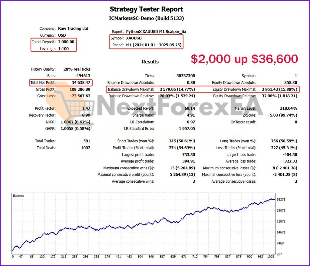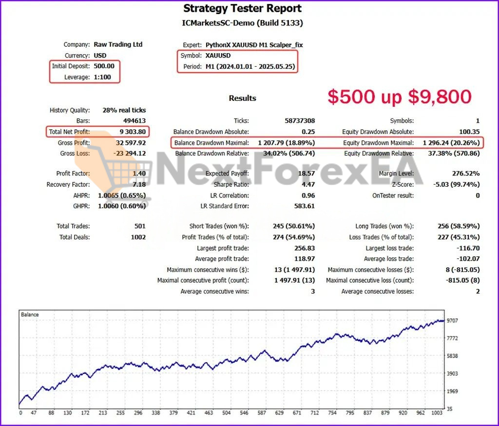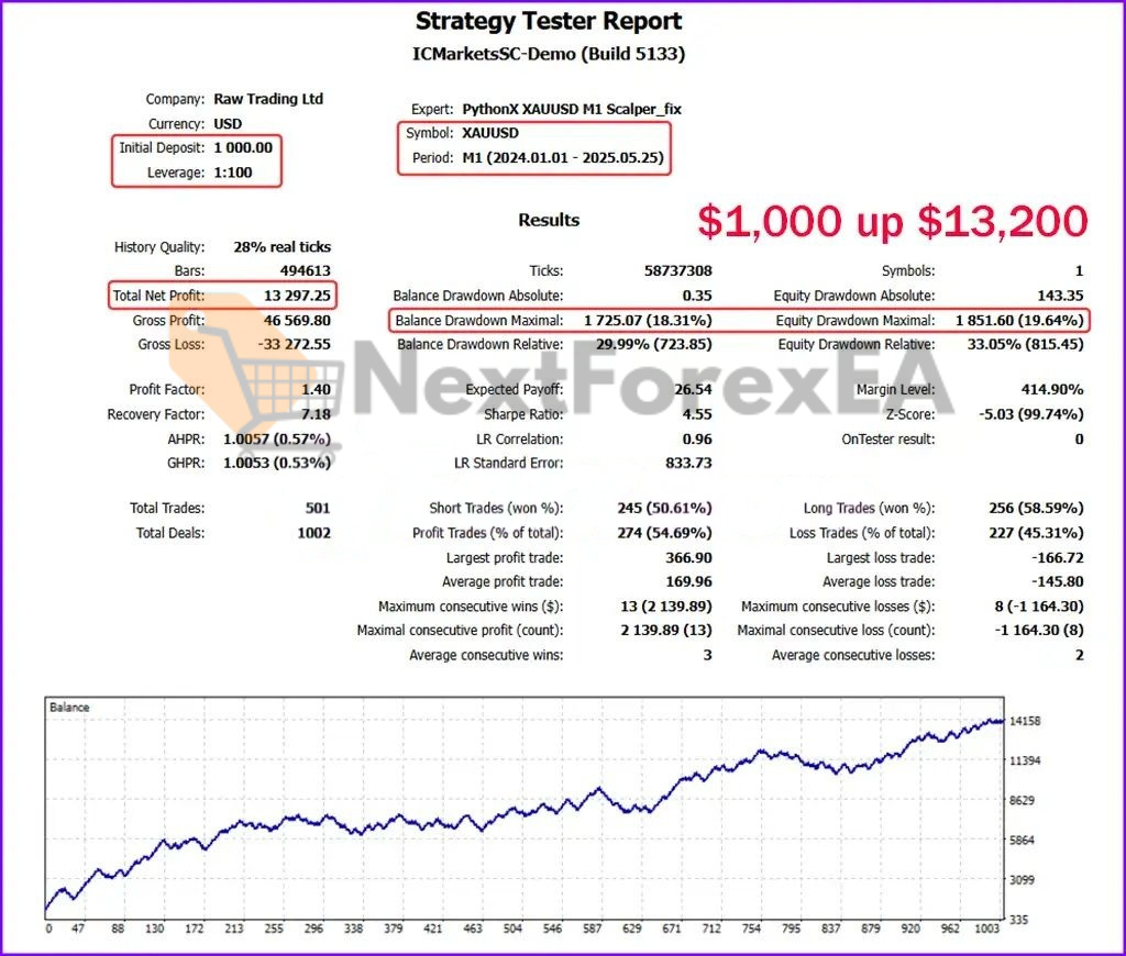 PythonX M1 Scalper XAUUSD v5.0 focuses exclusively on automated Gold scalping through precision engulfing candlestick pattern recognition. The EA achieved 1.40 profit factors in backtests across multiple account sizes, though the concerning 28% tick quality significantly undermines confidence in these results.