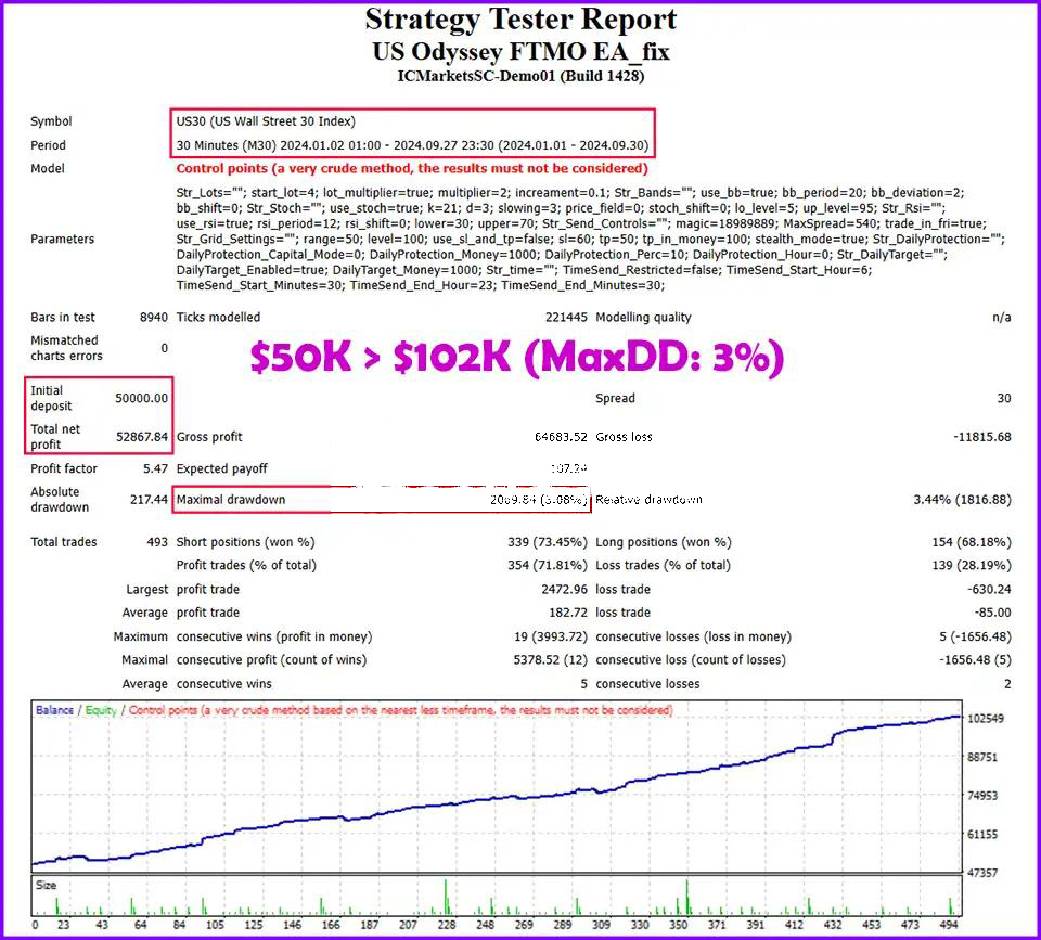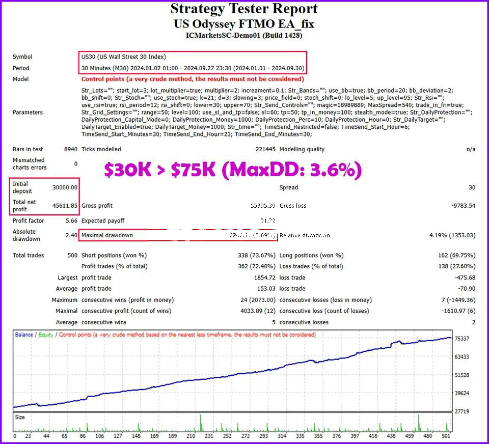Proven Results: The US Odyssey US30 EA demonstrated outstanding performance, turning a $10,000 deposit into $44,000 with a maximum drawdown of only 4.7%, ensuring stability even in volatile market conditions.